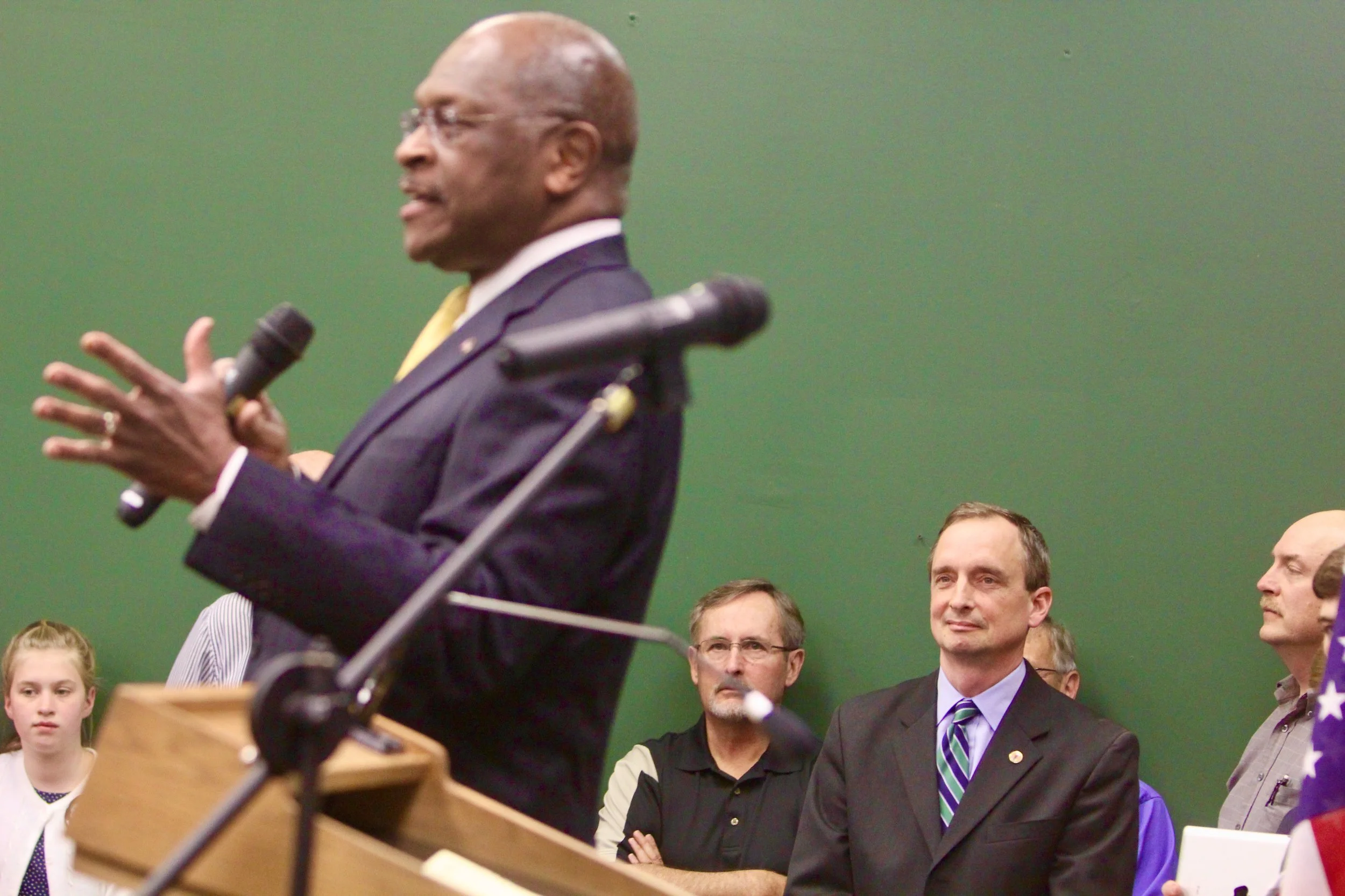 Left: Jack Hoogendyk, right, watches former Presidential candidate Herman Cain deliver a speech at a campaign rally.